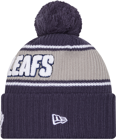 Maple Leafs New Era Bold Wordmark Logo Cuffed Pom Toque Embroidered graphics with raised details Cuffed knit hat One size fits most Material: 100% Acrylic